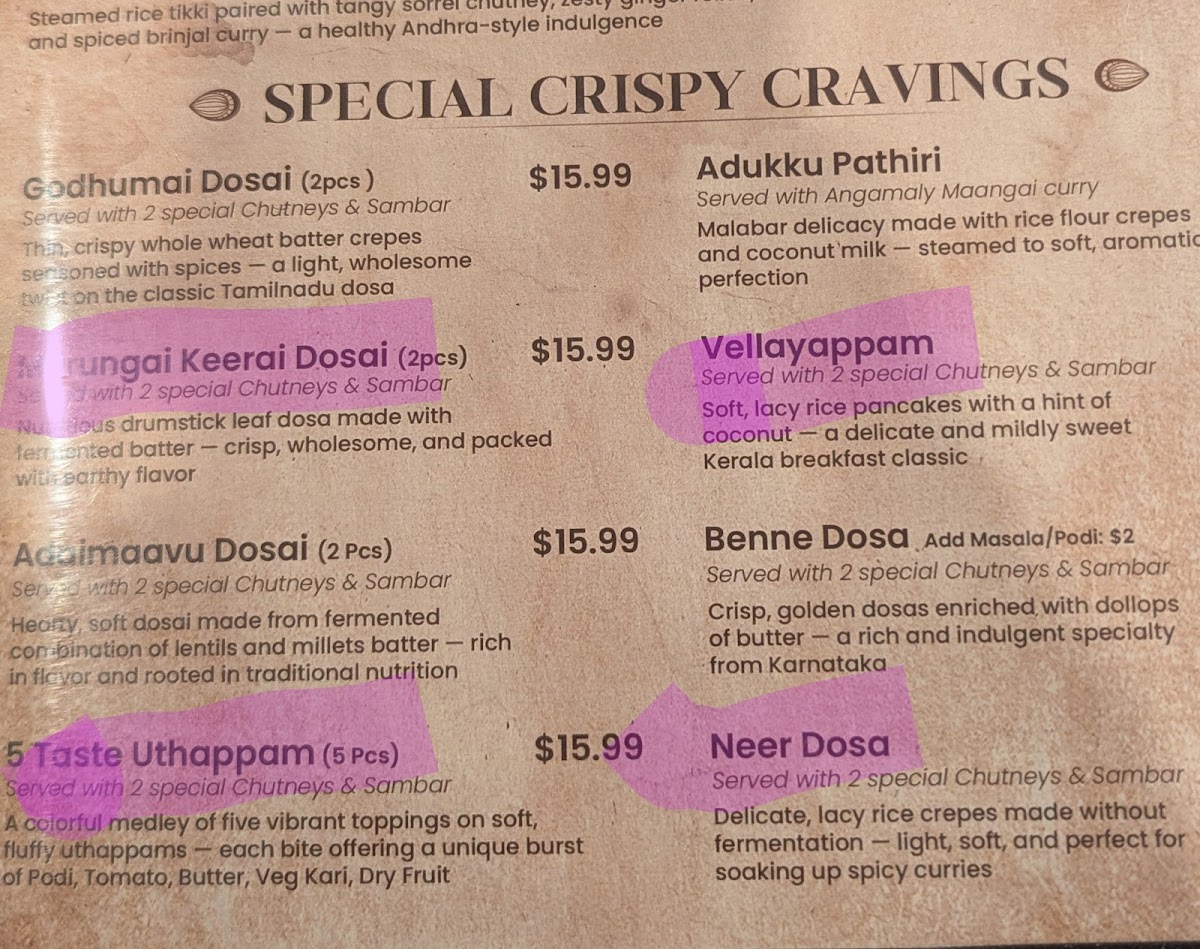 Gluten free. Classic south indian thin crepe made of rice & lentil filled with shredded cottage cheese and spices.